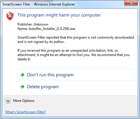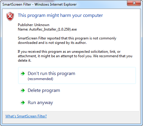 Internet Explorer 9 can make it difficult to download files from the internet, follow these instructions if it prevents you running AutoRec.